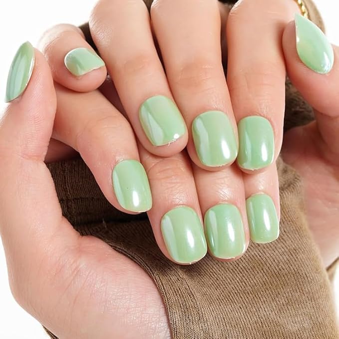 Handmade Light Green Chrome Fall Gel Glue on Nails