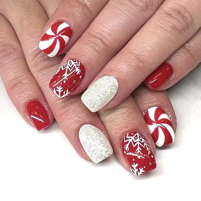Short square glitter white red acrylic nails deliver a bold yet structured holiday look. The red and white color combination feels festive and traditional. Glitter accents add brightness and visual interest. The square shape keeps the design crisp and modern. This style feels celebratory while remaining clean. It’s perfect for a confident seasonal manicure.