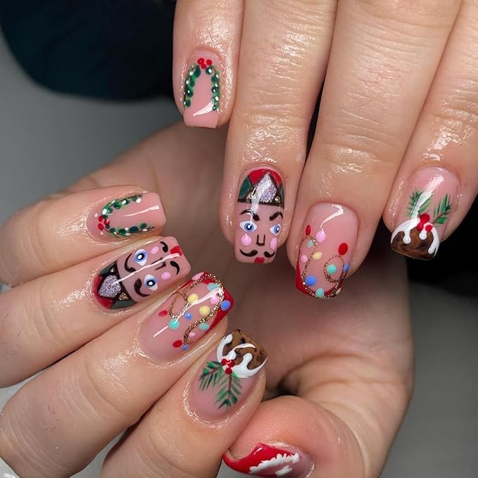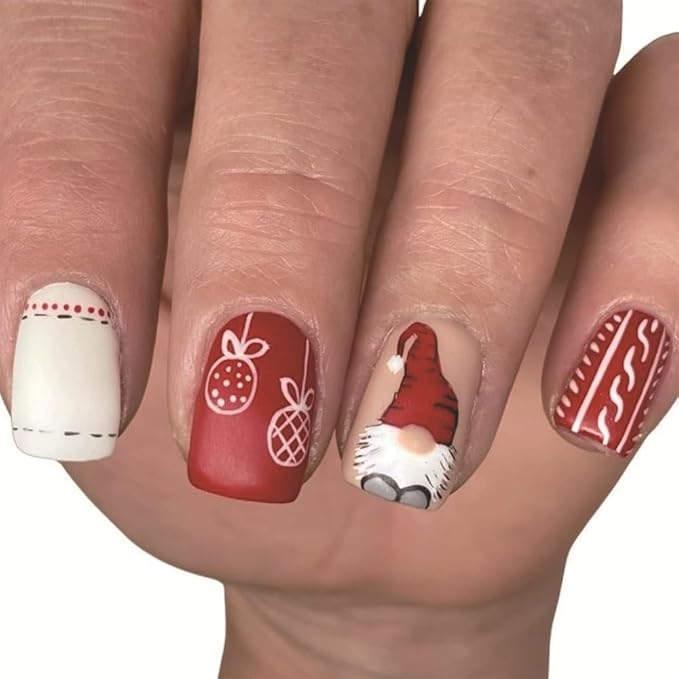 Santa Claus fake nails with a colored balloon pattern offer a joyful, festive vibe. The playful imagery adds personality and charm. Bright balloon accents bring a lively holiday feel. The overall design remains neat and wearable. This look feels celebratory without excess. A fun option for seasonal styling with character.