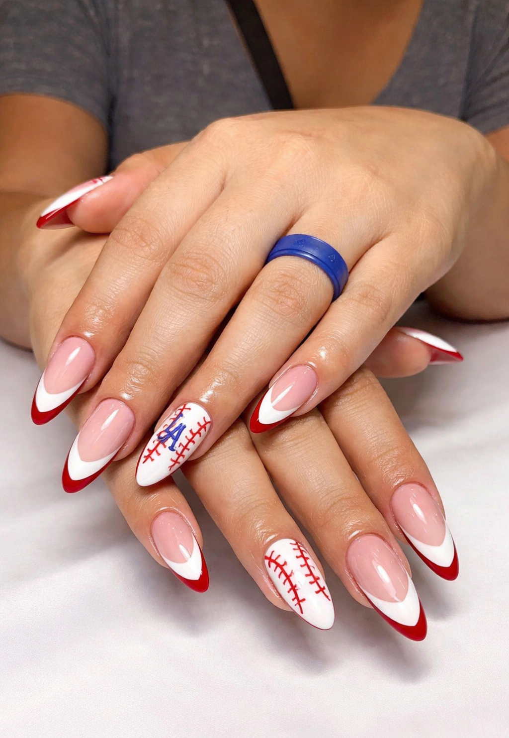 A sophisticated twist on baseball nail art, this design blends classic French tips with sporty detailing for a refined finish. The clean lines of the French tip add elegance, while subtle baseball accents introduce a playful contrast. The combination feels modern, stylish, and effortlessly polished. This look works beautifully for those who want a themed design without compromising on sophistication. It’s the perfect balance of chic minimalism and creative expression.