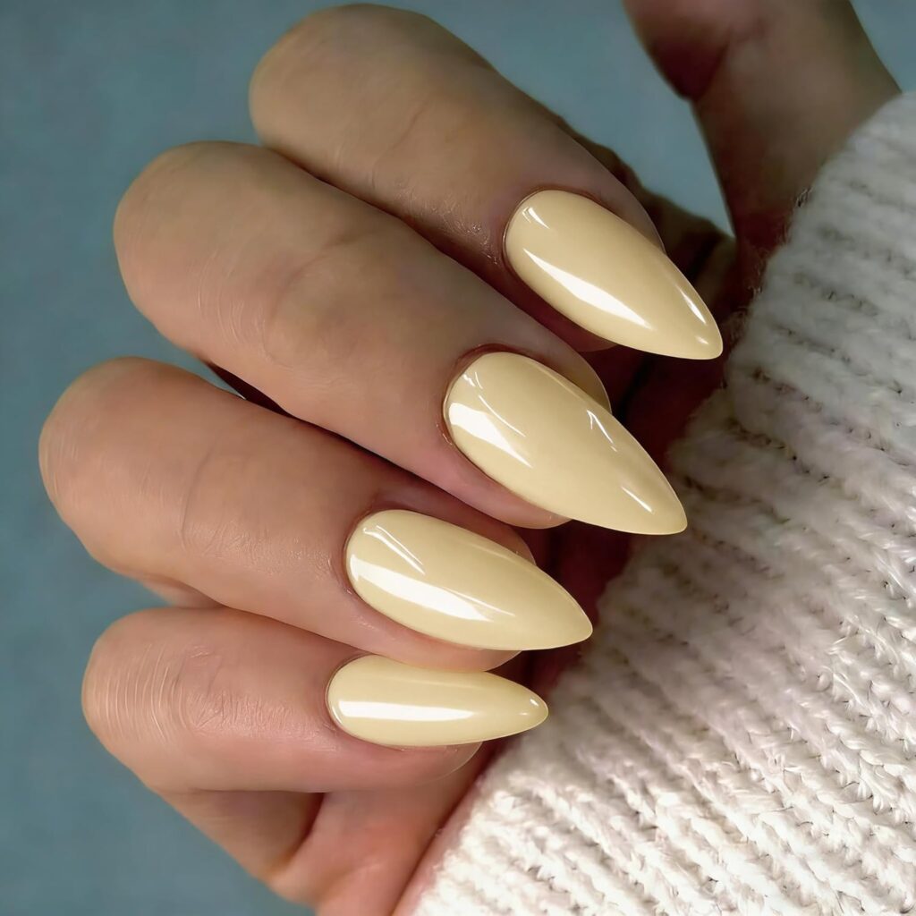 Light yellow soft nails introduce a gentle pop of color with a calm, polished finish. The muted yellow tone feels cheerful yet sophisticated, keeping the design balanced and modern. This style works beautifully for brightening a manicure without appearing bold. It adds a fresh, stylish touch to any look.