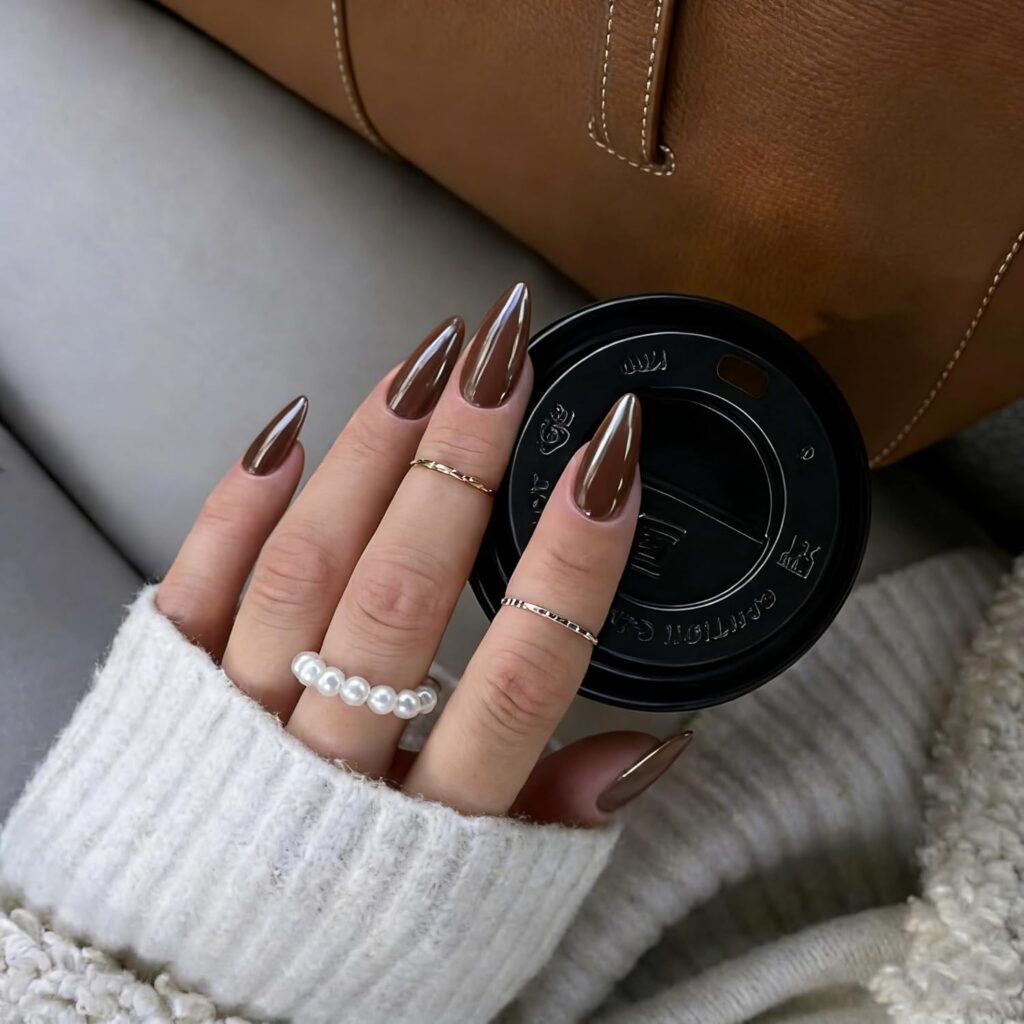 Sheer mocha gloss nails deliver warmth and depth through a smooth, translucent finish. The mocha tone feels rich yet light, creating a balanced and elegant manicure. Glossy shine enhances the sheer quality, giving the nails a refined and luxurious look. This design feels modern, wearable, and effortlessly stylish. It’s a perfect option for those who want neutral nails with a soft, dimensional finish.