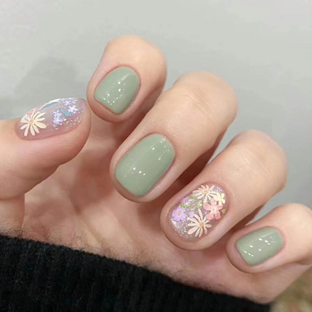 Pastel floral sage nails deliver a soft, nature-inspired look that feels fresh and elegant. The muted sage base combined with delicate floral accents creates a refined, polished aesthetic. Ideal for spring or summer, this manicure complements a variety of outfits while maintaining sophistication. The pastel tones enhance the gentle charm of the floral details. A serene and stylish choice for hands that want understated beauty.