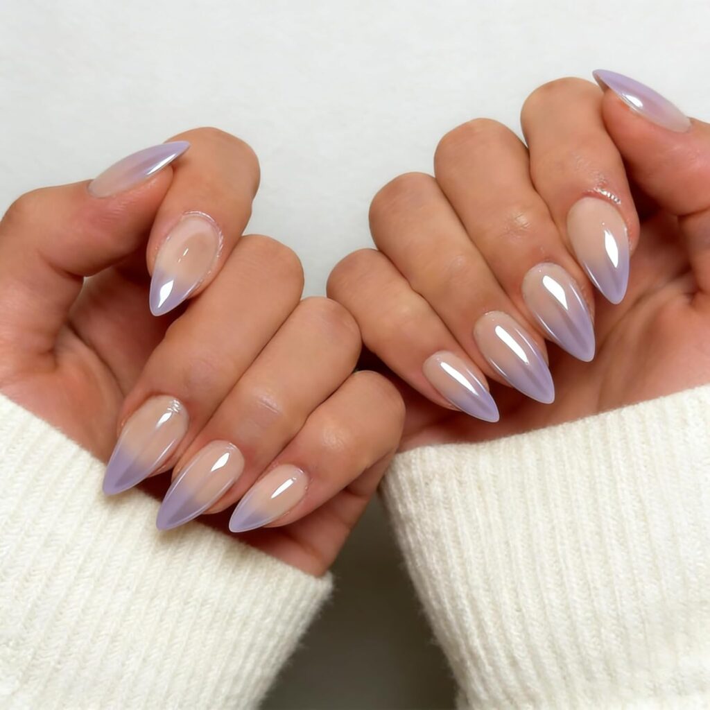 Ombre lilac almond nails showcase a graceful gradient from soft to deeper purple tones, creating a dreamy, fashion-forward look. The almond shape adds a feminine, elongated effect to the hands while maintaining elegance. Perfect for spring or summer, this manicure blends softness with a subtle statement. Its smooth gradient finish ensures a polished, salon-quality appearance. A stylish choice for those who enjoy sophisticated, trendy nails.