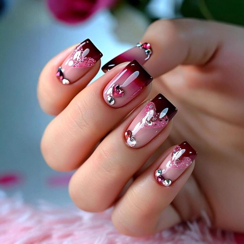Rose Red Heart Nails present a softer take on classic Valentine red. The rose-toned shade feels warm and refined. Heart details add a romantic touch without overwhelming the design. This manicure feels timeless and feminine. It’s ideal for understated elegance. The overall vibe is graceful and seasonally chic.